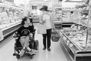| 生活全般にヘルパーの援助は欠かせない。ヘルパーと買い物をする鈴木さん(左) |