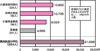 収入は、年金額が月一〇万円未満の人が約六割、本人の年間収入百万円未満の人が約五割。そのなかで、介護 保険サービスの利用料は平均で一万九〇〇円。食材料費や保険外負担、通院の交通費、おむつ代などの介護関連費用、さらに医療費などをあわせると、平均で二 万一〇九九円にもなっていました(上表)。