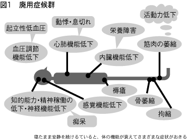 廃用症候群とは、寝たまま安静を続けていると使わない機能が衰えてしまっておきる症状(図1)のこと。心臓や肺の機能が落ちると動悸や息切れがおきます し、骨や筋肉が弱くなって、関節が硬直して動かせなくなったりします。