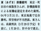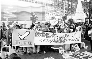 東さんの控訴審が結審した昨年一二月二四日は傍聴席には入れませんでしたが、報告集会でもらった中村尚達 弁護士の意見陳述を読んで圧倒されました。中村弁護士自身も三歳の時、長崎で被爆しています。爆心から約三キロで直爆を受けたお父さんは、一九年前食道が んで死亡されたといいます。