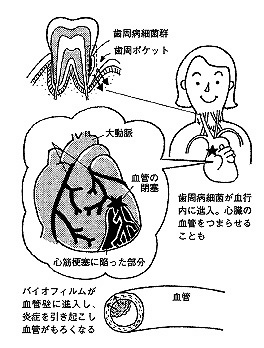 口腔内とくに歯周ポケットの中のバイオフィルムからは繁殖した歯周病細菌が出て、歯周組織から血行内に侵入します。一部は気道や食道の粘膜を通して体内に入り、次のような病気をひきおこすことが知られています。