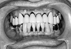 右の写真は、20年前、抜けた歯やぐらぐらした歯があったため、全部の歯を連結して固定した患者さんです。1年に1回、定期管理を欠かさず、68歳のいまも、健康な歯肉としっかり噛む力を維持されています。