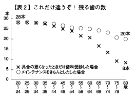 日本人は、40歳から平均2年に1本の割合で歯を失い、80歳では平均8本しか残っていません。「8020=80歳で20本の歯がある」は、ほど遠い目標です【表2】。