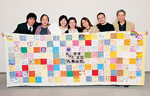 昨年九月二八日に一〇四人で発足した、みなと医療生協「九条の会」。会員は四月一日現在三四〇人に。発足直後にまずとりくんだのが、タペストリー作りで す。会のモットーは「会員一人ひとりが主人公」。それを形にしようと、一人ひとりが平和への思いを一五センチ幅の布に書き、それを縫い合わせ、大きなタペ ストリーにしました。会のシンボルとして、企画のたびに掲げています。