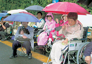 | 雨のなか、国会前で座り込みを続ける障害者、患者ら(6月16日、提供・しんぶん「赤旗」) |