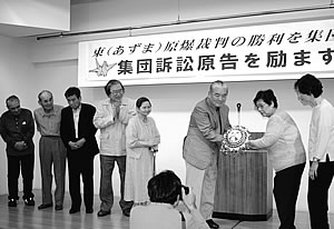 | 東京の集団訴訟原告を励ますつどい。京都訴訟の小西さんから東訴訟の東さんに贈られた勝利のカサが、こんどは東夫人から東京の原告団に贈られた |