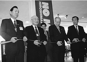 | 5月にニューヨークの国連本部で日本被団協が開いた初めての原爆展。秋葉広島市長(右端)、伊藤長崎市長(左端)とともに |