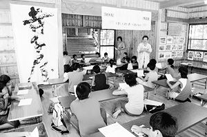 勉強する内容は「読み、書き、計算」を基本としながら毎回違います。八月六日は子どもの権利条約のうた 「待たないで」を歌ったあと、視覚障害者への音声訳ボランティアをしている村田英子さん(77)による「ちいちゃんのかげおくり」の朗読を聞きました。続 いて「漢字のお経」。その学年で習う漢字を語呂よく並べ、お経のように何度も音読して覚えてしまおう、というもの。