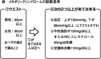 「メタボリックシンドローム」(代謝症候群)が注目されています。まず、左表の診断基準に自分をあてはめてみてください。