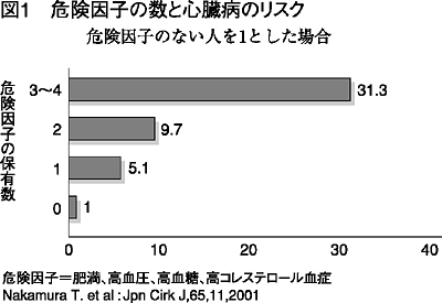 なぜ騒がれているのかというと、この状態が動脈硬化を起こす危険が極めて高いためです。図1は心臓病と危険因子の関係を表したものです。私たち医師も検 査結果の見方を変えることを迫られています。「ちょっと高いだけだから、大丈夫」ではなく「いくつ危険の芽(!)を抱えているか?」が問題なのです。