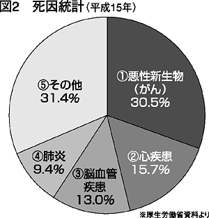 図2をみてください。死因の1位は悪性新生物(がん)30・5%ですが、2位の心疾患と3位の脳血管疾患はいずれも動脈硬化が原因の病気です。2位と3 位を足すと28・7%で、1位とほぼ同じ率になります。