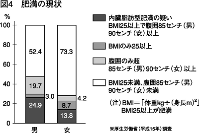 厚生労働省の調査では、肥満(BMI25以上=注)で、かつウエストがこの85センチ(90センチ)以上の人が男性で24・9%、女性で13・8%い て、内臓脂肪型肥満の疑いがあるとしています(図4)。