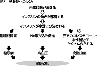 図5をみてください。血液に脂肪の量が増えると、インスリン(すい臓から出るホルモン)の分泌を促します。インスリンは血糖を下げる働きと同時に、脂肪 を蓄積しやすくする働きも持っています。