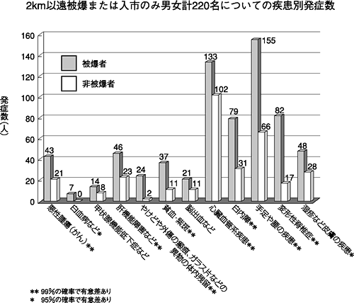 調査の核心は、原爆投下から2週間以内に爆心地に入った人(入市被爆者)と、2礰以遠で被爆した人(遠距離被爆者)で、278人のうち220人。国から 「原爆放射能の影響はない」とされ、原爆症認定を申請しても却下されている人たちです。このなかで下痢・脱毛など放射能障害の急性症状を発症した人は 143人(65%)。悪性腫瘍(がん)にかかった人は43人で、21人だった非被爆者の2倍以上に達しました。がんだけではありません。変形性脊椎症4・ 82倍、白内障2・5倍、肝臓機能障害2倍など、8つの疾病でいずれも発症率が一般を大きく上回ります。
