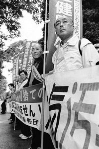 「大気汚染被害者が安心して受診でき、人並みの生活ができるように、国と自動車メーカーの責任で新 しい救済制度を作らせること、それが私の願いです」―東京大気汚染公害裁判・二次原告の初山彰一さん(56)は、「足立健康友の会」の会員です。九月上旬 から一カ月続いた東京地裁への要請行動に、携帯酸素ボンベを抱えながら参加してきました。