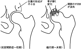 原因の多くは、出生時の先天性股関節脱臼や、大腿骨頭を覆う臼蓋の形成が不十分なために起こります。これらは日本人に多く、生まれつき脱臼していたのに 見逃されていたとか、乳児期のオムツのあて方が悪かったなど、さまざまな理由があげられています。