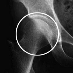 最初に股関節の痛みが出て、次第に股関節の動きが悪くなり歩きにくくなります。かなり初期の段階ではレントゲンでははっきりわからないことがあります。 その場合は、骨シンチグラム(わずかな放射線を出す薬を体内に投与してX線で撮影)や、MRI(電磁波により撮影)で早期診断をおこなうことがあります。 ある程度進行すると、レントゲンでも容易に診断できます(図6)。