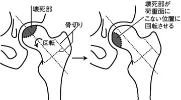 骨頭に十分正常な部分が残っている場合には、正常な部分に荷重がかかるように切り取った骨頭を回転させ、再度接合させる手術をおこないます(図7)。骨 頭の壊死が広い範囲におよぶ場合は、人工関節に置き換えます。
