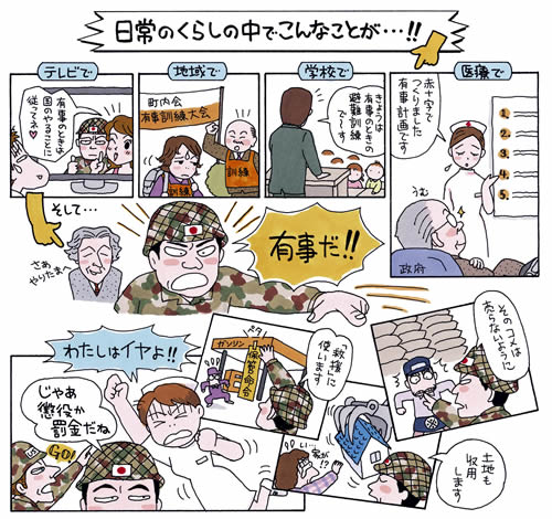 04年に成立した「国民保護法」も急ピッチで具体化しています。「国民保護」とは名ばかり。米軍、自衛隊 が軍事活動を自由におこなうために国民を統制・管理・動員するための法律です(イラスト参照)。政府が「有事」を宣言すると、国民総動員体制がとられま す。「周辺事態法」(99年成立)にはなかった懲役刑や罰金が定められ、従わなければ「六カ月以下の懲役又は三〇万円以下の罰金」です。