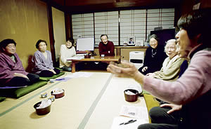 「最近のニュースや自分の感じたこと、関心のあることなど、ここでは思ったことが話せます」と山岸恵子さん。唯一の五〇代です。母親の田中妙子さん、娘の山岸美緒子さん(老人保健施設・手取りの里職員)の親子三代で班会に参加しています。