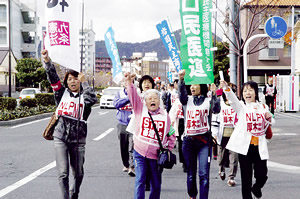 | 3・19集会で「米軍機くるな」「9条守れ」とデモをする山口民医連のみなさん(写真・若橋一三) |