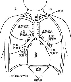 まず、肺の構造がどうなっているか、胸部X線写真(写真1)と模式図(上図)を見ながら説明しましょう。