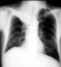 | 写真3 進行性肺がんだった患者(右肺上部が白く写っている) |