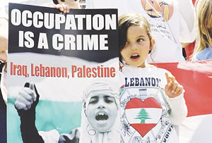 | 「占領は犯罪」と書かれたプラカードを持って集会に参加するレバノン系アメリカ人の少女 |