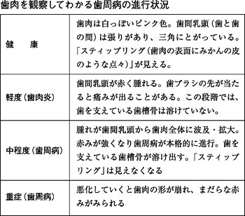 鏡の前で唇をめくって歯肉を見てください。まず、色は? 歯肉の形は? 表は歯肉を観察してわかる歯周病の進行状況です。