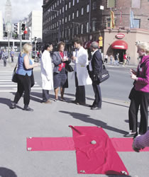 | IPPNWの行事として行われた医学生による行動。「地面においた赤いXマークに核兵器が炸裂するとしたら、どう考えるか」。―核兵器について、その実相を説明しながら市民と対話 (写真・平山武久) |