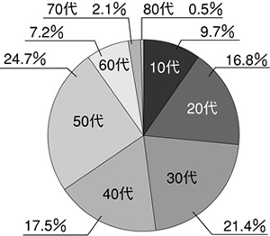受診者は増加しており、年齢別の割合、受診内容はほぼ図表(前ページ)の通りです。10歳台から80歳台まで幅広く、内容も多彩です。