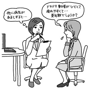Aさんは「動悸、疲れやすさ」を訴え外来にこられました。お話を聞くと、月経は順調でホットフラッシュもないということ。「とにかく疲れて仕事もできな い」という状態でした。脈拍が速かったので甲状腺ホルモンの採血検査をしたところ数値が高く、甲状腺機能亢進症がわかりました。すぐに内科に紹介し、治療 が始まりました。