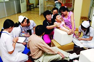 「ベトナム・タイニンの地域リハ ビリテーションを支援する会」。京都民医連の尾崎望医師ら有志で、二〇〇五年に立ち上げたNPO法人です。枯葉剤の影響調査のため一九九五年からベトナム に通い始め、障害を持った子を助けてほしいという親の思いに直面して、具体的な支援が求められていると痛感。〇二年、タイニン省がおこなう「地域にねざし たリハビリテーション計画」に協力することを決め、継続的な支援を続けるため、「会」を立ち上げました。〇六年も七月三〇日~八月三日の五日間、医学生・ 看学生とともにタイニン省を訪問。そのリポートです。