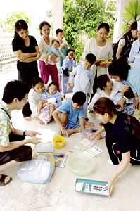 健診の合間のシャボン玉遊びに興味津々の子どもたち。その姿に思わず笑顔になる母親。日本もベトナムも同じです。本当は親たちはみな、この子たちが友だ ちと一緒に楽しく学べる場があればいいと思っているに違いないでしょう。