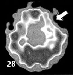 | 発作間のないとき、(矢印)の部分は色が薄く血液が十分流れていないことがわかる。同部分がてんかんの起点と考えられる |