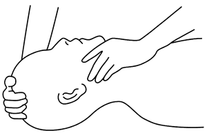 体を抑えたり、ゆすったり、口の中へハンカチを入れたりするのはよくありません。ガクガクとけいれんしている間は、下あごに手をあてて、上方にしっかり 押し上げます。こうすることによって、空気の通り道が確保でき、窒息したり舌をかむのを防ぐことができます(図4)。