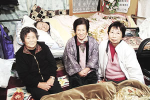 榎本さん(左端)宅で。右に柏木さん、折木さん。後に寝ているのは榎本さんの夫でやはり原告の馨さん