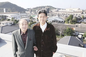 チッソ工場を背に、松本さん(左)と大石さん。水俣協立病院屋上で