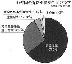 日本では10万人に対し、5~10人程度と考えられています。近年の分析では、孤発性が65%、遺伝性が28%で、残りのうち5%ほどが家族性痙性対まひ(主に両足がつっぱる)とされています(グラフ)。
