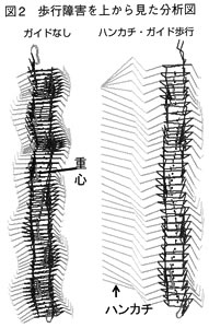 健常者と患者がハンカチを軽く引き合いながら歩く「ハンカチ・ガイド歩行」は失調性歩行による左右の揺れを大幅に減らし、歩幅も大きくなり、規則的で速度が速くなります(図2右)。
