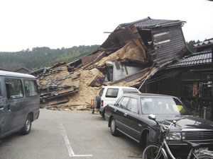地震の翌日から、金沢市内の城北病院や診療所、新潟・福井・富山などから支援に来た職員は、友の会会員さん宅に印をつけた地図を持って、地域をまわりま す。診療所付近で倒壊した家は少なかったものの、それは外観だけ。家の中は天井が崩れ、壁には大きな亀裂。窓ガラスが割れ、ベニヤ板で風を防いでいる家も ありました。