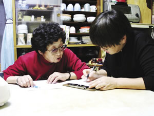 | 東京保健生協での調査。組合員の高野イツさん宅で (06年10月26日「民医連新聞」提供) |