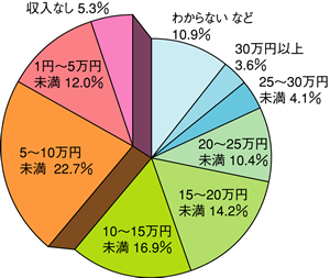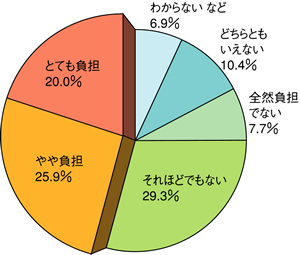 | 図1 本人の月収「10万円未満」が4割 | 図2 医療、介護の支払いについて半数近くが「負担」と |
