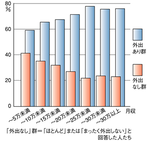 「『ほとんど』または『まったく』外出しない」という人(「外出なし」群)は、全体の三分の一。この群には、「健康上の理由で日常生活に支障がある」と 答える割合が高く、その内容は家事や入浴、食事、起床などすべての項目にわたりました。また「近所づき合いがない」という人は二割いました。所得が低いほ ど「外出なし」の割合は高まり、「月収五万円未満」では四割が「外出なし」群です(図3)。