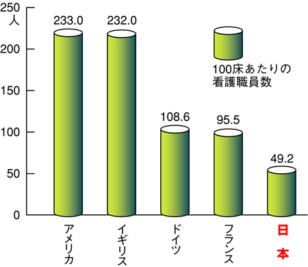 看護現場、とくに病棟に勤務する看護師たちは、激務を強いられるようになっていました。平均在院日数の短縮や電子化、入院患者の重症化、複雑になる医療 機器、安全性への細心の配慮など、仕事の密度は高まっても、看護師は欧米と比べて極端に少ない配置です(図)。就職後一年を待たずに辞めてゆく新人、燃え 尽きるベテラン、病気で現場を離れるスタッフも増えました。「初心を忘れてしまいそう」「看護の感動を味わえない若手が育ってしまう」こんな悲鳴もあがっ ていました。