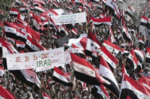 | 旧フセイン政権が崩壊して4年目の07年4月9日、イラク中部ナジャフで米軍の占領に抗議する数十万人のデモがあった。宗教色を排除し、イラク国旗を掲げて統一イラクをアピールした(写真提供REUTERS/AFLO) |