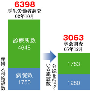 お産の場は日本中で減っています。二〇〇二年から二〇〇五年の三年間で、分娩できる施設が半分に減っていたことが、日本産婦人科医会の調べで、わかりま した。九四~〇四年の一〇年間で、日本の医師数は四万人増えているのに、産科医は九〇〇人も減っています。激務で産科医のなり手がいません。常勤医師数は 一施設平均二・四五人、大学病院をのぞくと一・七四人、二人に満たない状態です。