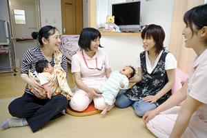 | 産後一カ月健診に来たお母さんたちと。右は助産師の中川さん |