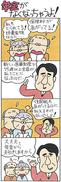 「まだまだ知られていない後期高齢者制度を多くの人に知らせることが大事だ」と相野谷さんは強調します。対立ではなく手をとりあって、いっしょに社会を 変えることが必要です。その手始めが参議院選挙です。 イラスト・高村忠範