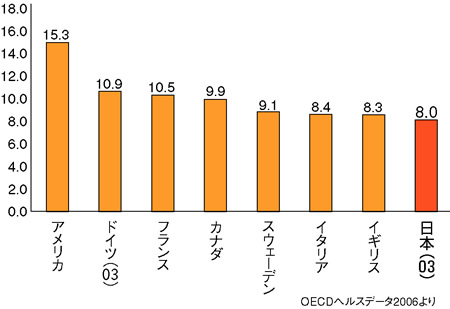 | 図3 OECD加盟国・医療費のGDP比 (2004年、速報値、一部2003年含む) |